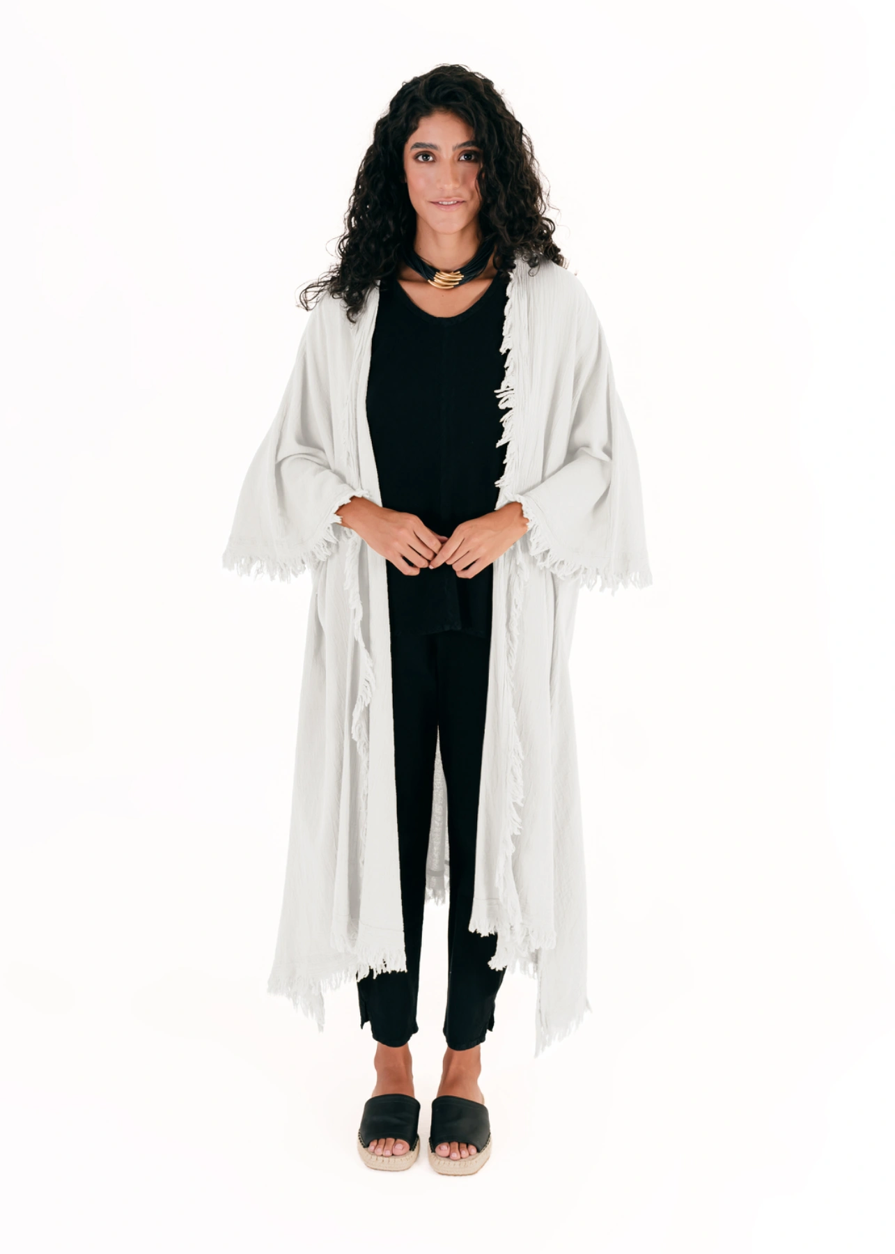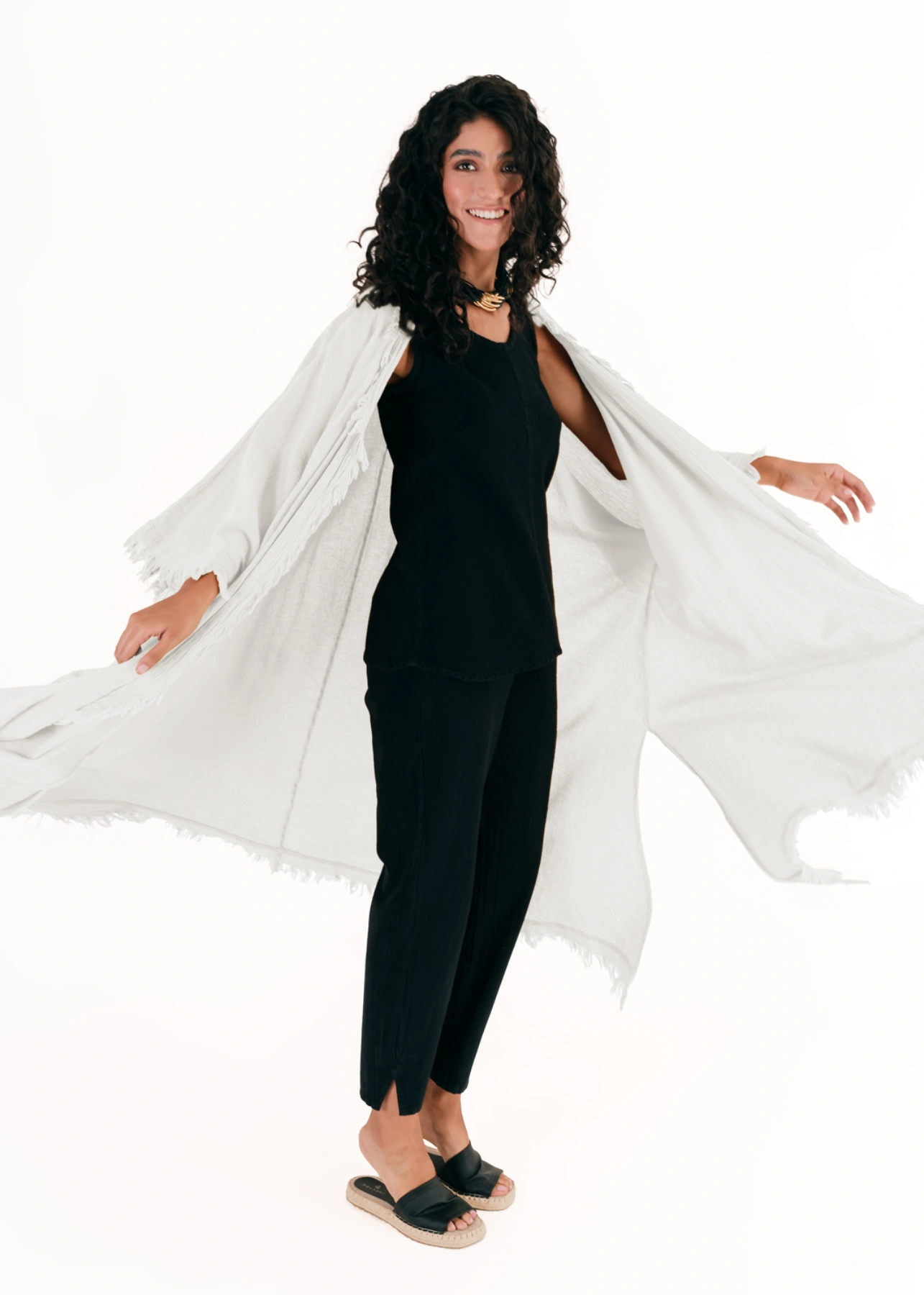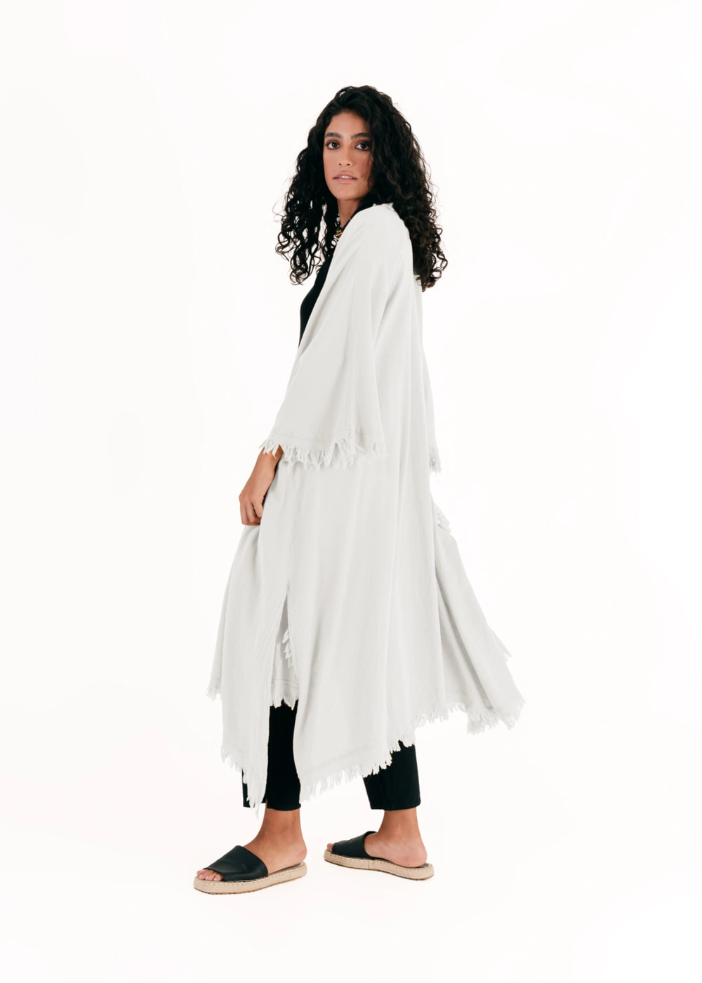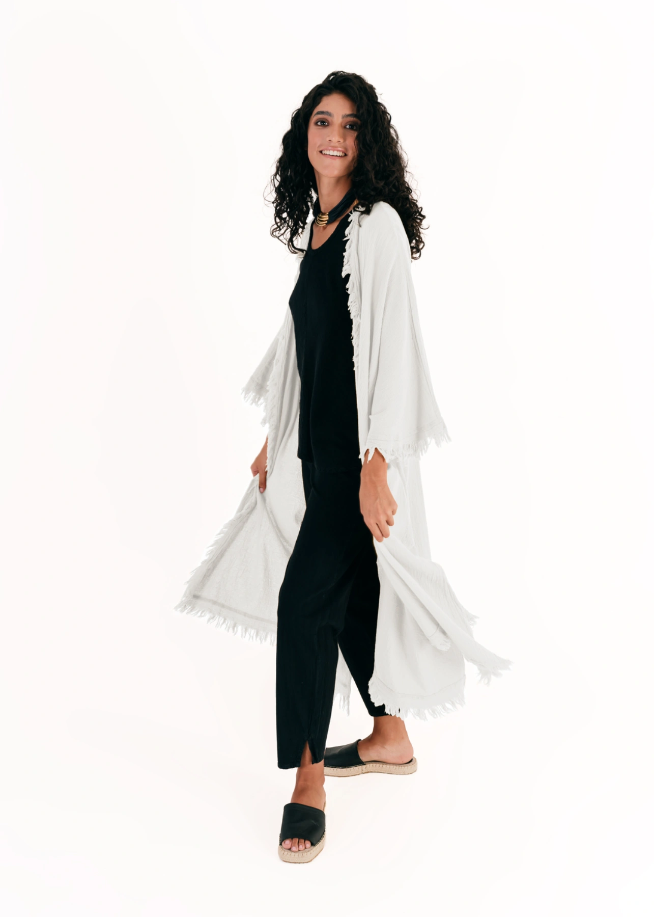 Este saco oversize destaca por su silueta fluida y abierta, con un largo que estiliza y mangas 3/4 que terminan en delicadas barbas. Una pieza versátil que se mueve entre lo casual y lo elegante: perfecto para elevar un look urbano o para llevar como salida de playa. Su esencia bohemia con un giro sofisticado lo convierte en un imprescindible que acompaña con naturalidad cualquier ocasión.