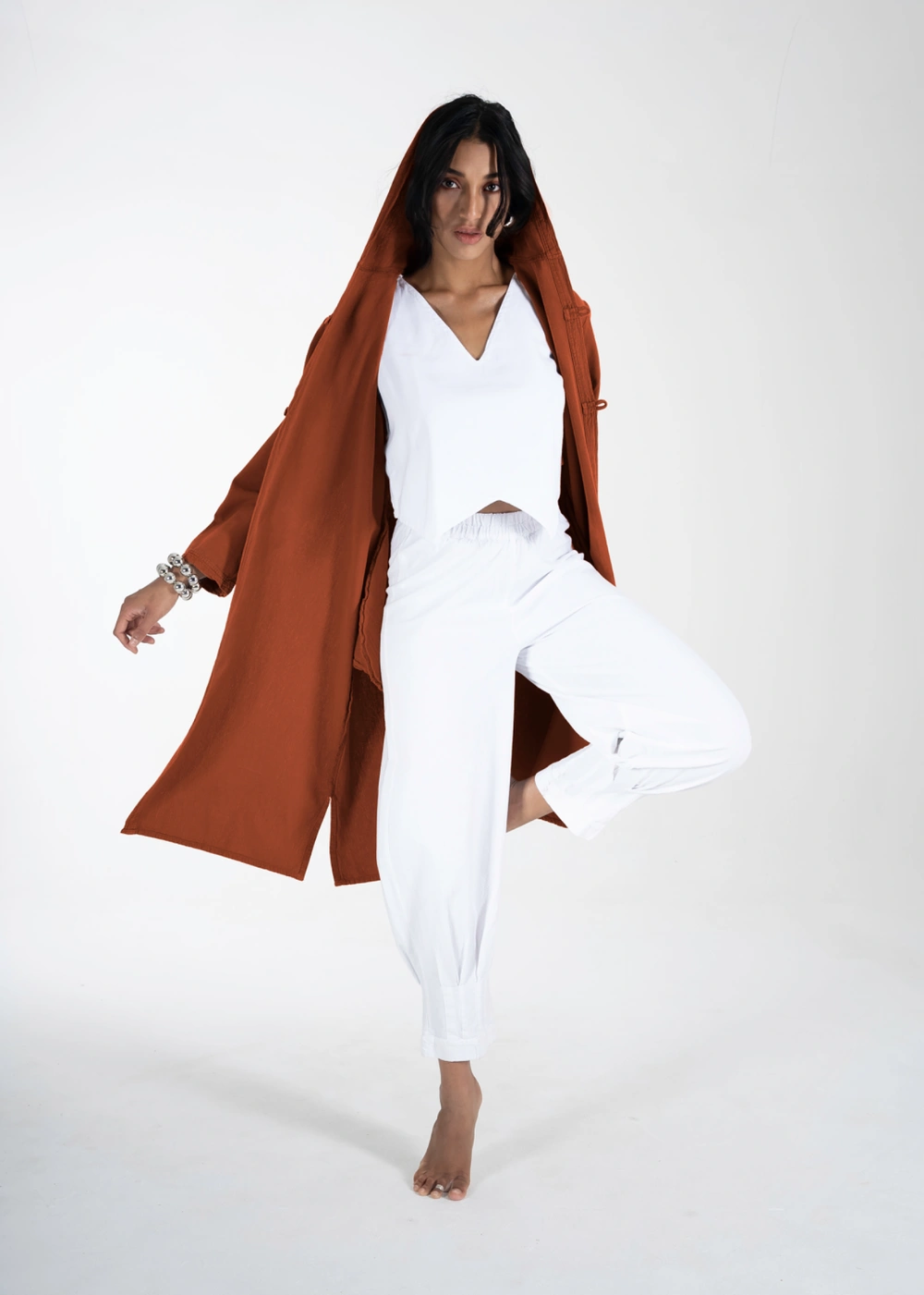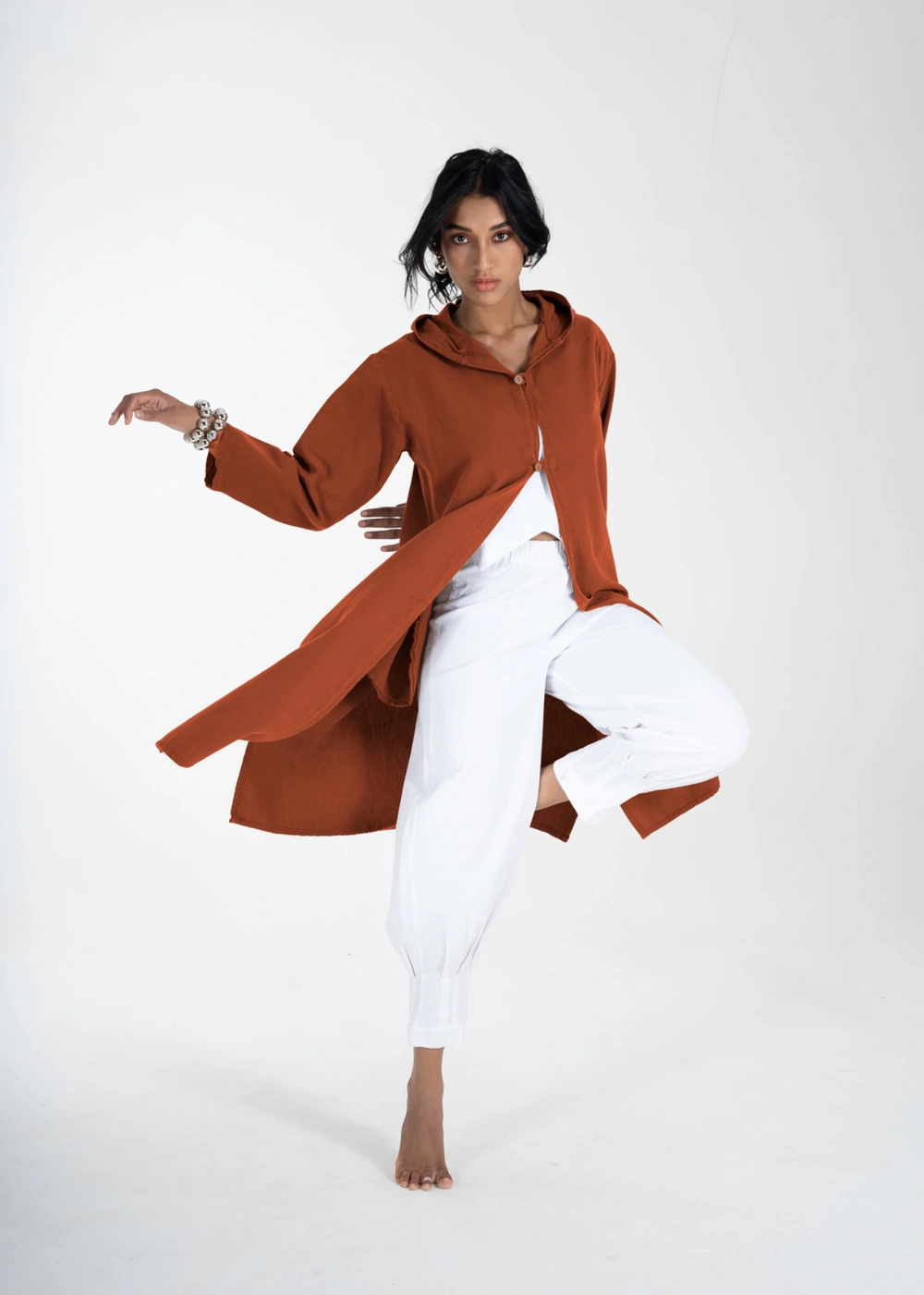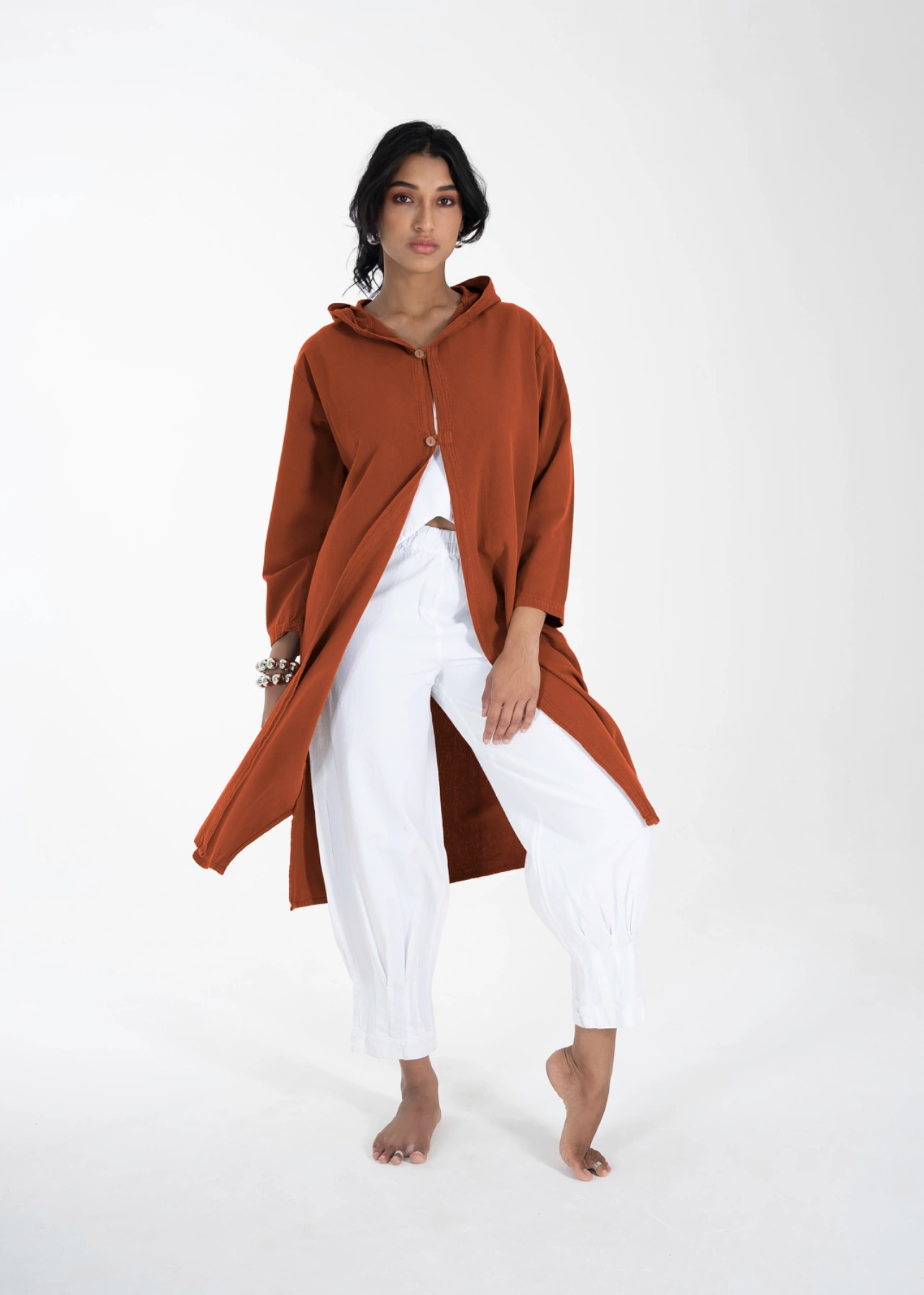Este saco midi es una prenda urbana imprescindible. Con una capucha y mangas largas, cuenta con dos pequeños botones de madera en la parte delantera. Las bolsas laterales ocultas añaden un toque práctico y discreto, mientras que las aberturas en los costados permiten mayor libertad de movimiento. Ideal para un look relajado y moderno, este saco es perfecto para cualquier ocasión casual en la ciudad.