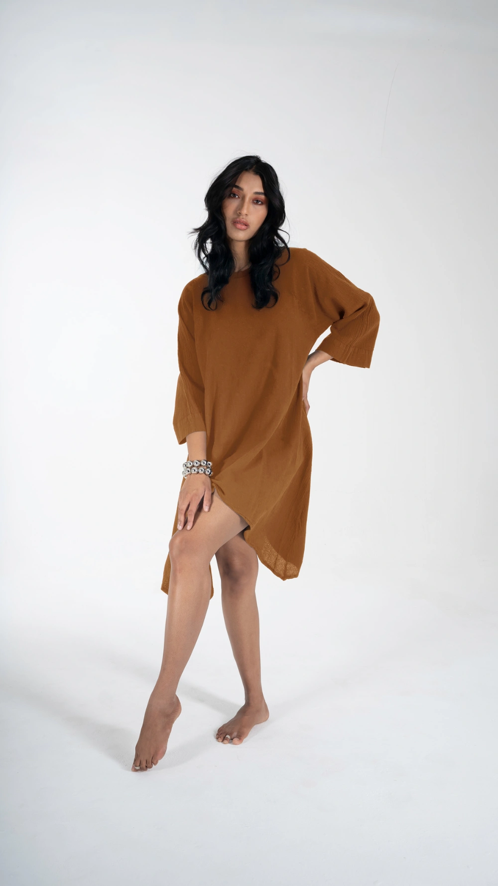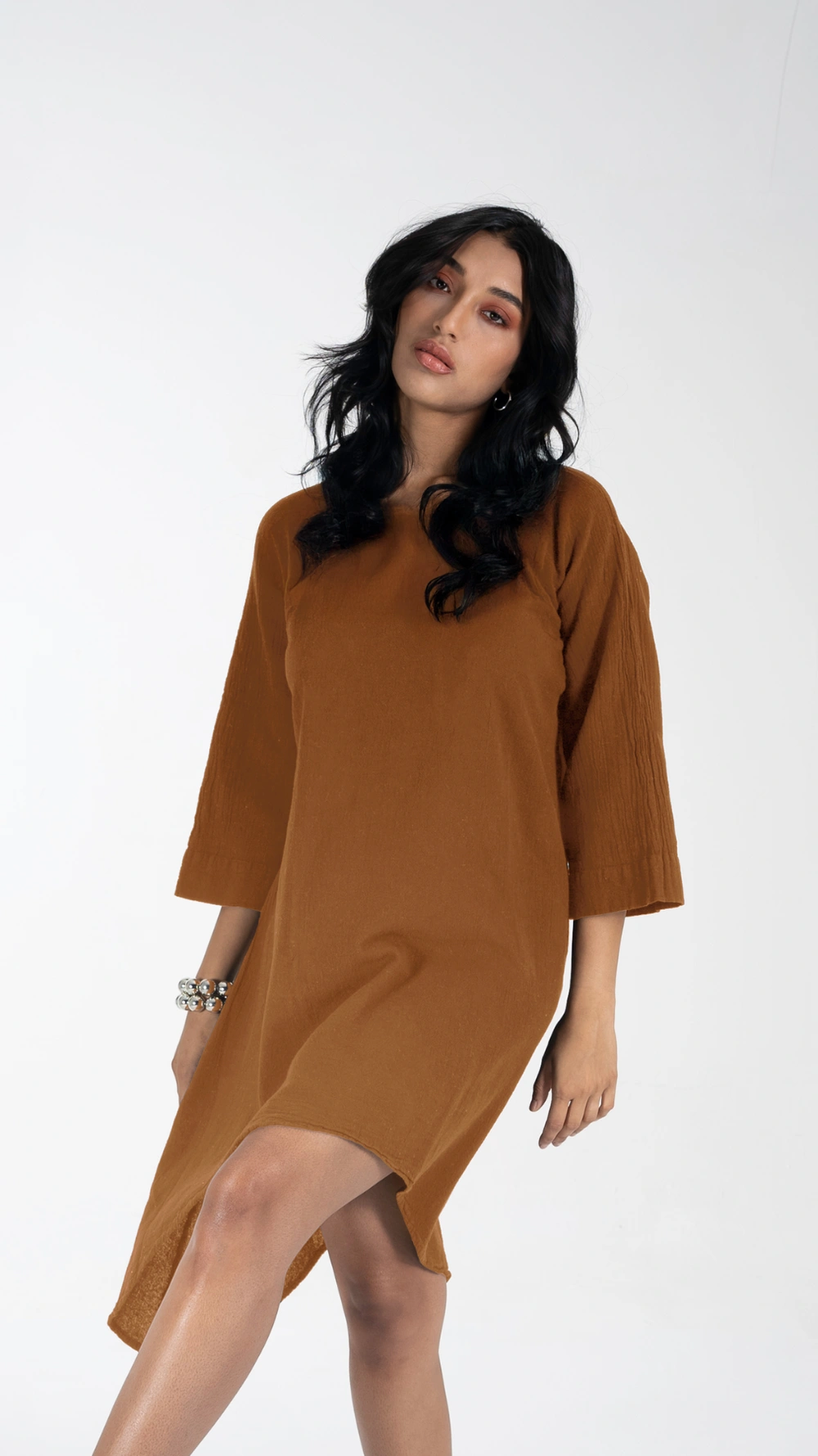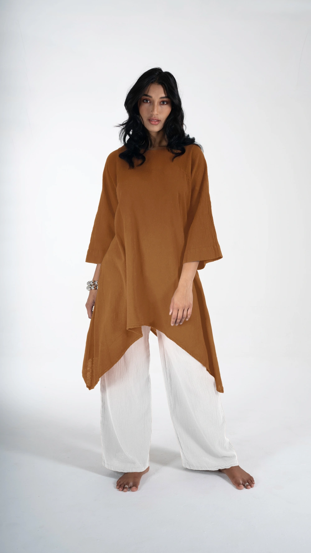 Esta blusa de corte asimétrico presenta un diseño contemporáneo y versátil que también puede funcionar como vestido. Ofrece un ajuste cómodo y favorecedor para diversas figuras. Sus mangas ranglán 3/4 añaden un toque casual y práctico, mientras que la terminación en picos a los lados le confiere un estilo único y moderno. Ya sea que la uses como blusa con pantalones o como vestido, esta prenda es una elección ideal para looks modernos y cómodos.