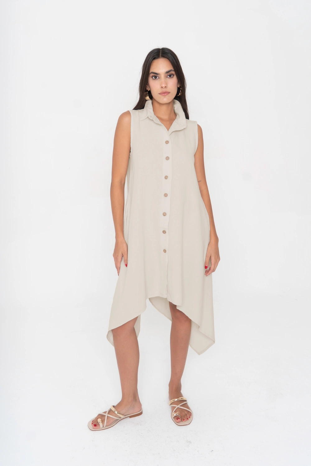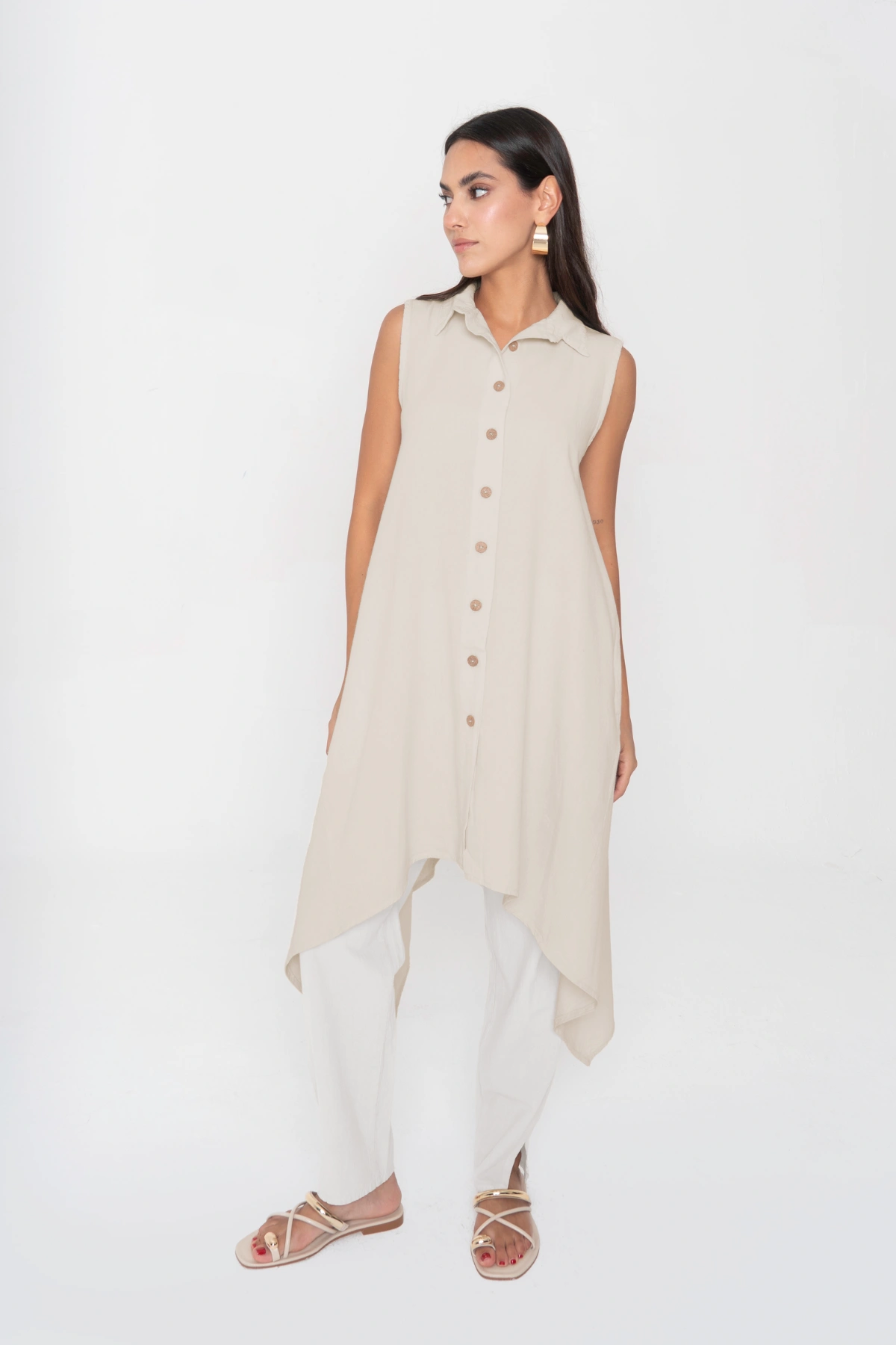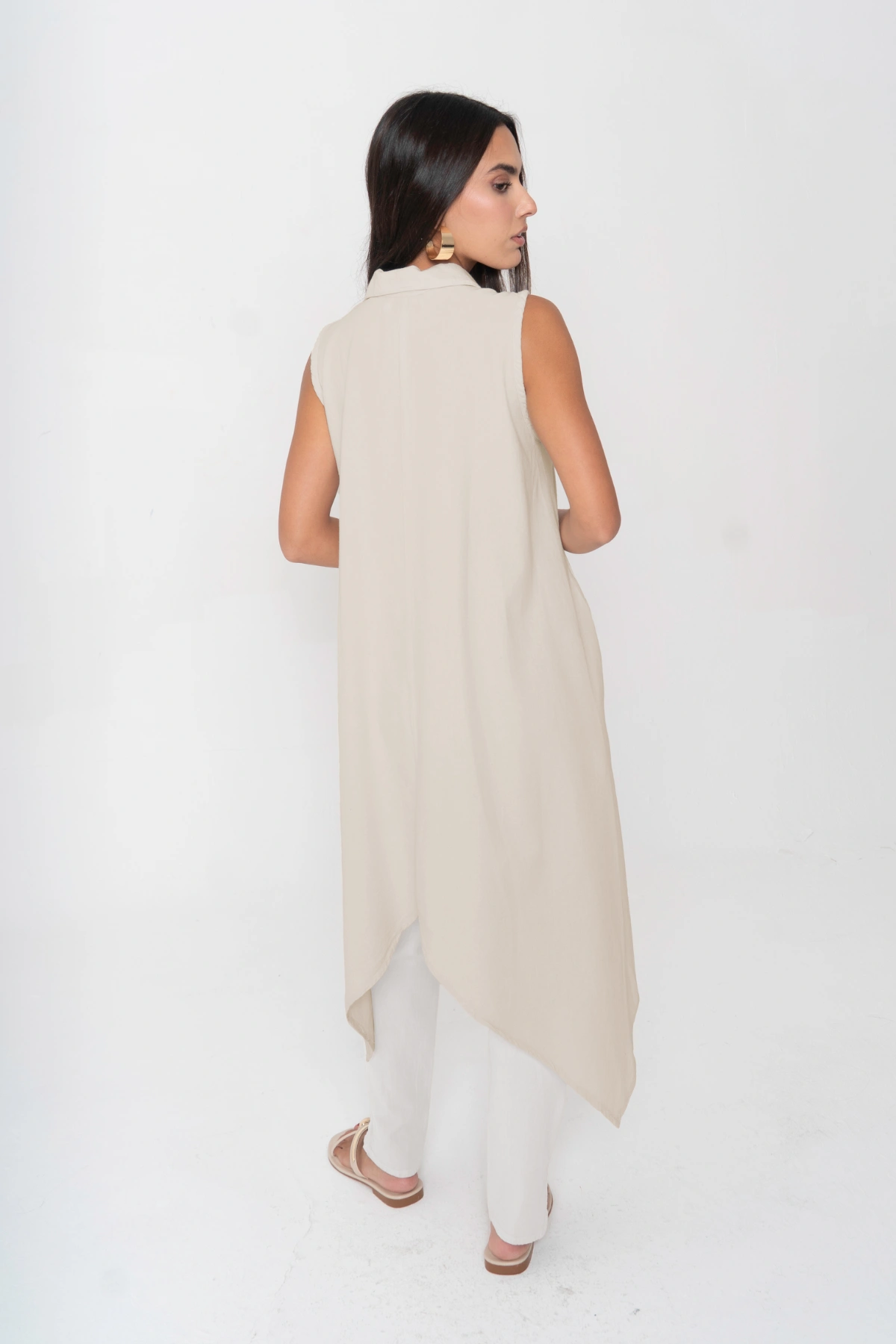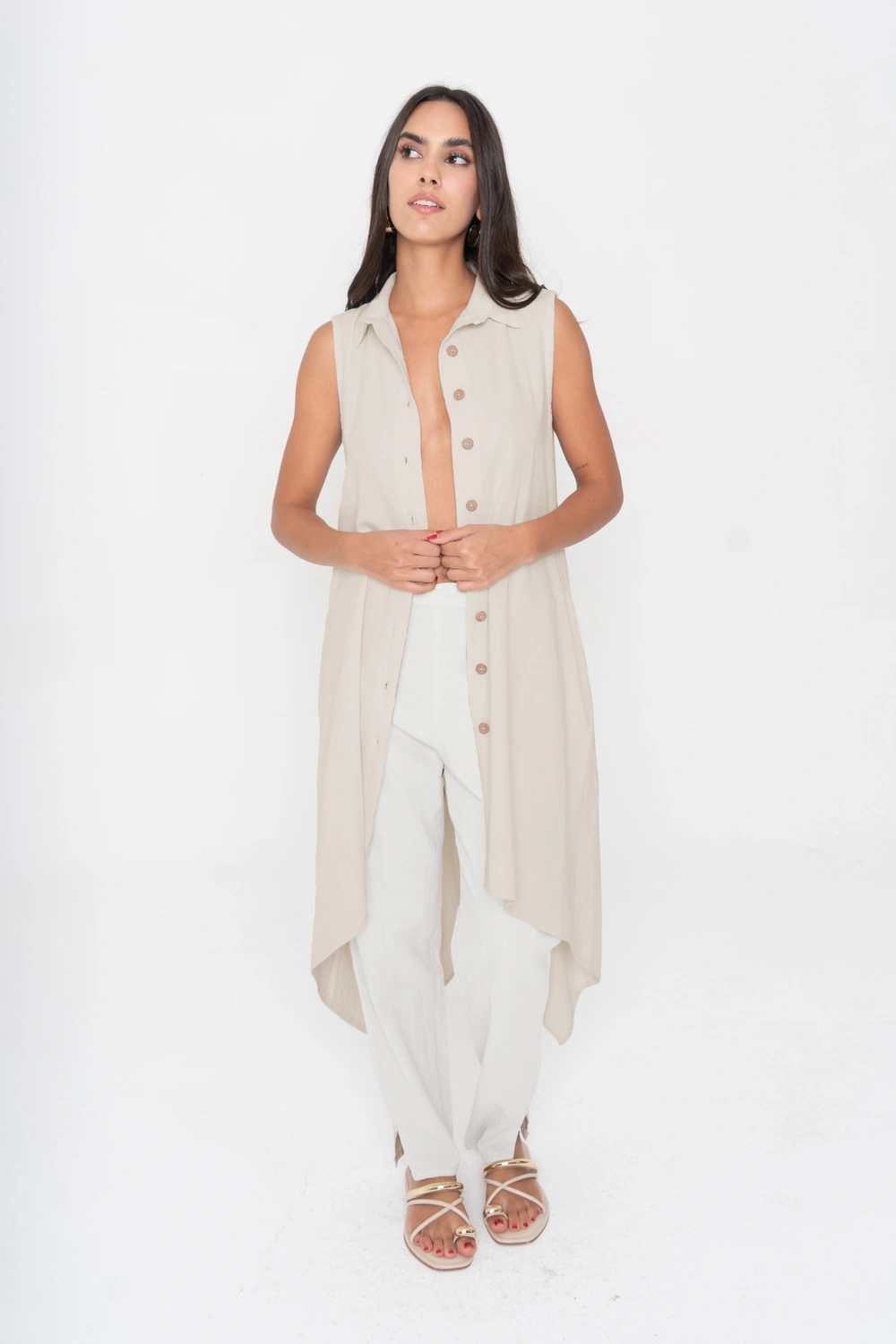 Una reinterpretación fresca del blusón Nora. Esta versión sin mangas conserva la silueta oversize y la botonadura frontal, pero se transforma en una pieza ligera y versátil. Puede llevarse abierta como chaleco largo, cerrada como vestido camisero o incluso como salida de playa. Su caída en línea A y el bajo asimétrico con picos alargados añaden movimiento y sofisticación, logrando un look moderno y relajado.