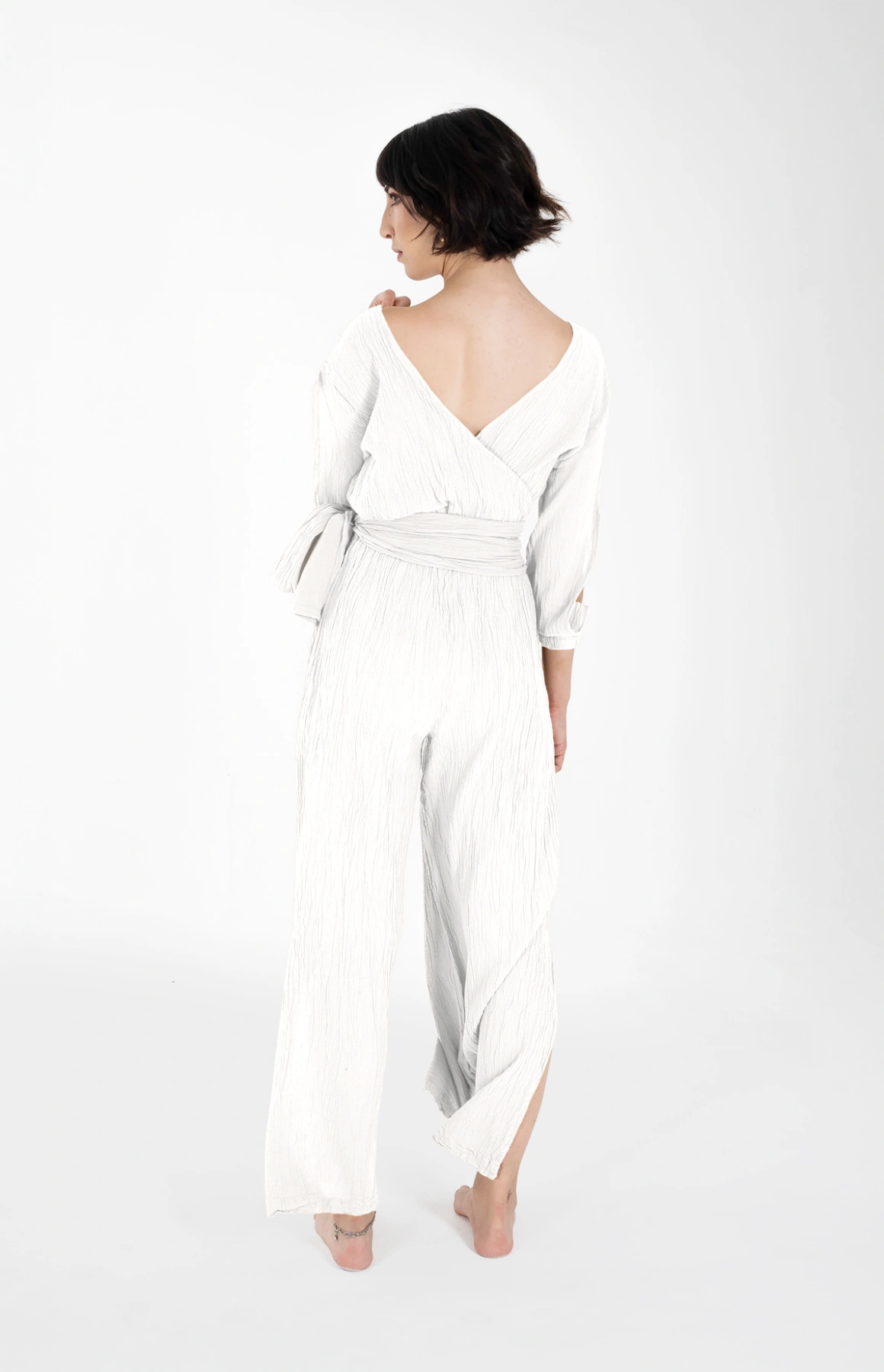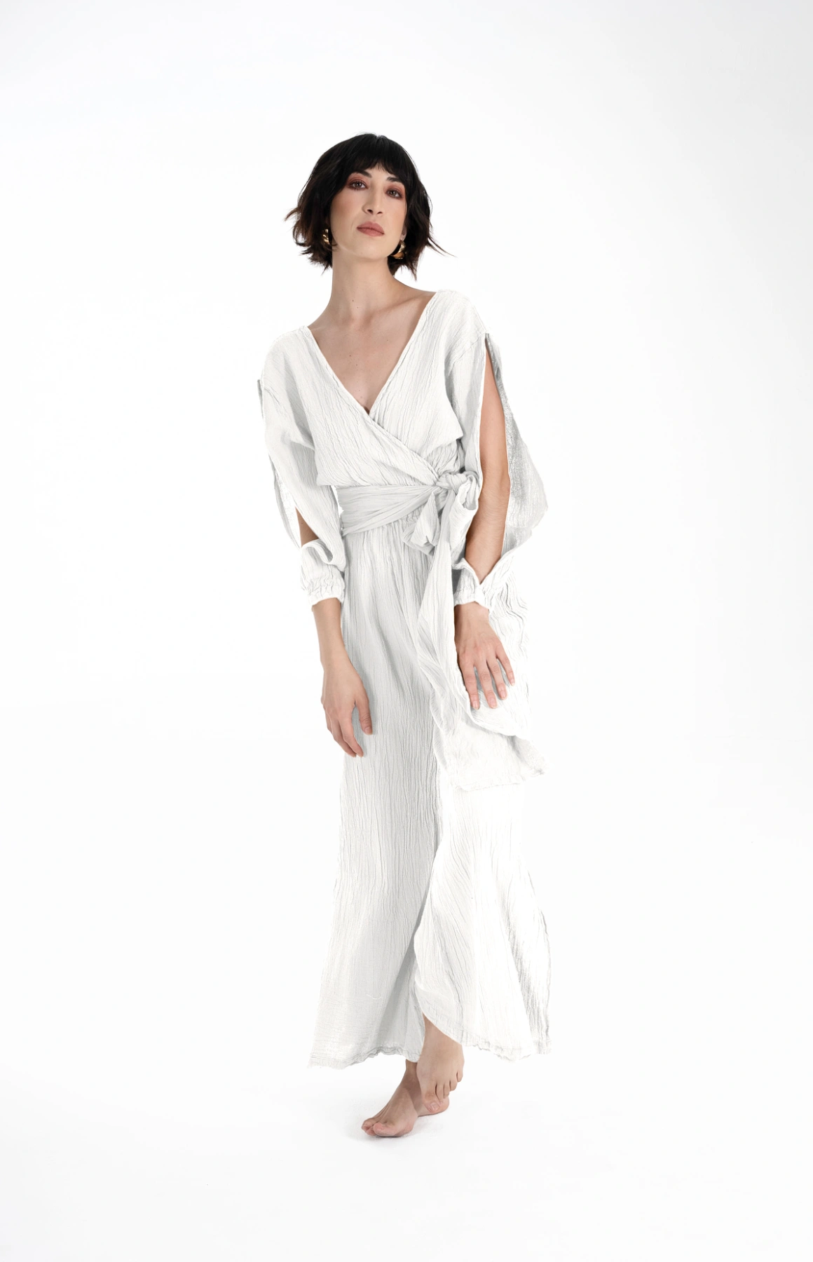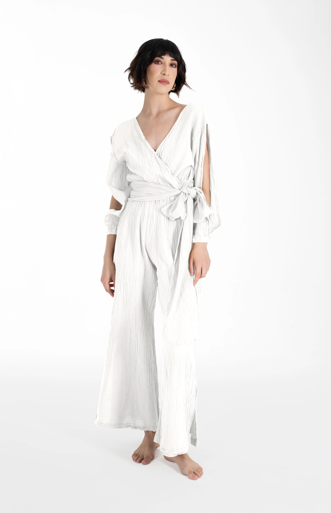 Este jumpsuit deslumbra con su silueta fluida y contemporánea. La cintura elástica abraza suavemente la figura, mientras que sus mangas largas, abiertas desde el hombro hasta la muñeca y rematadas con delicados puños de resorte, añaden un movimiento inesperado y elegante. Su corte en línea A con aberturas laterales lo convierte en una pieza versátil que combina ligereza y carácter. Perfecto para transformar cualquier ocasión, de una salida casual a un evento especial, en un momento de estilo memorable. Nota: la banda no está incluida.