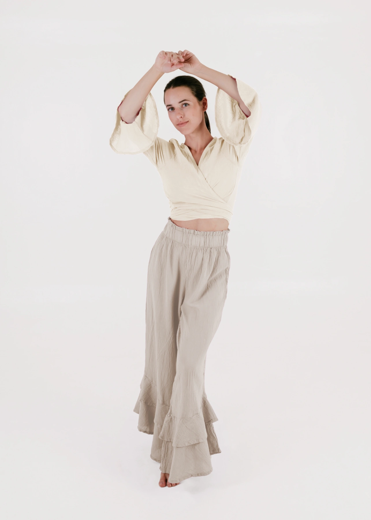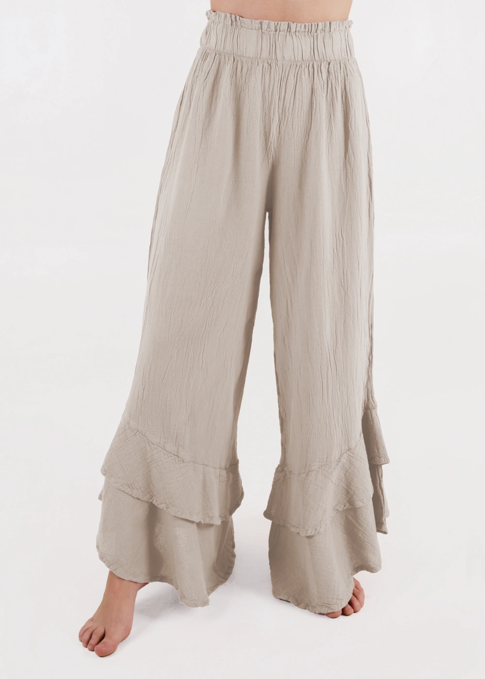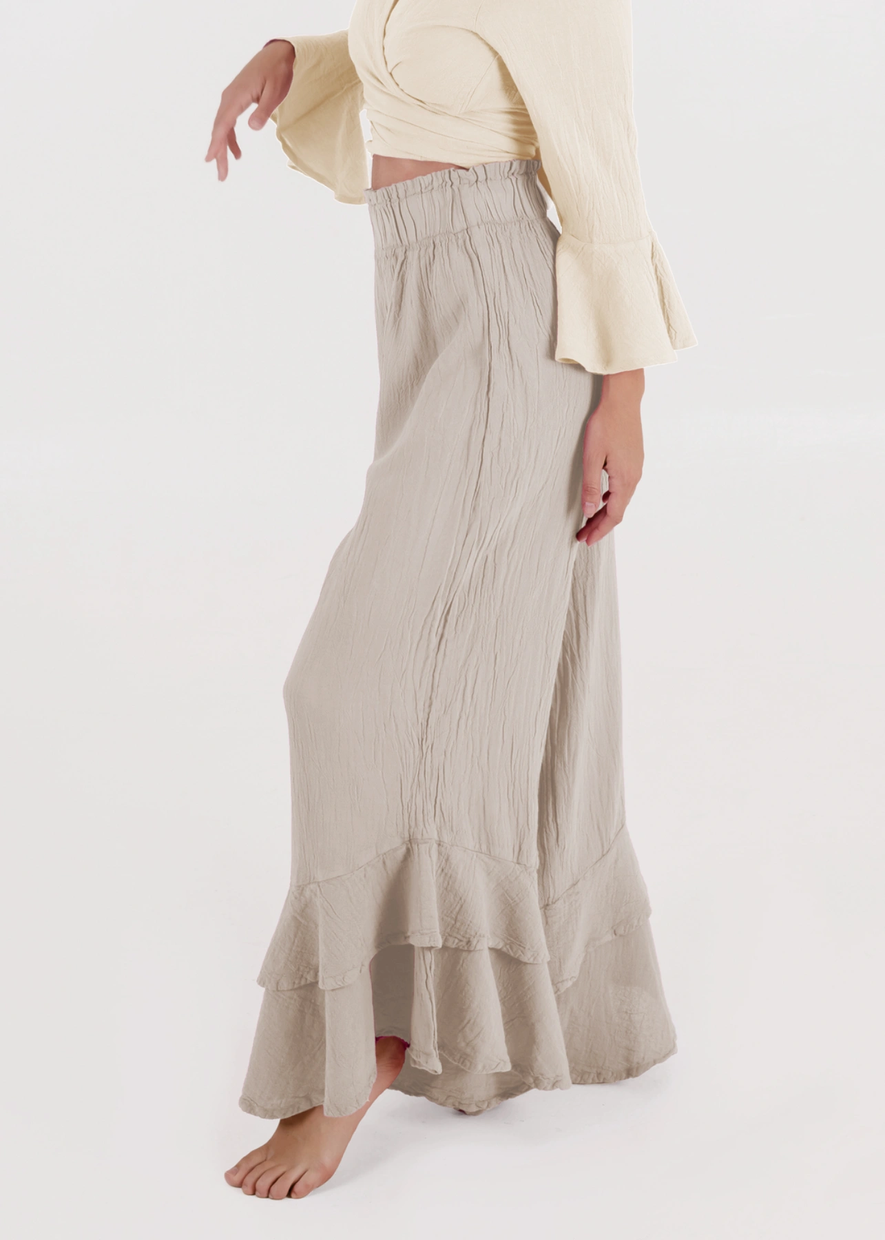 Este pantalón de tiro alto combina comodidad y movimiento con un aire distintivo inspirado en el dramatismo de la danza y el vestuario clásico español. Su cintura ancha con resorte abraza con suavidad la silueta, mientras que los olanes dobles en el bajo evocan el vuelo de las faldas flamencas, aportando un dinamismo único a cada paso. De corte limpio y sin bolsillos, es una pieza pensada para resaltar la figura con un toque femenino y atemporal. Perfecto para quienes buscan un look versátil que transite con naturalidad entre lo cotidiano y lo especial.