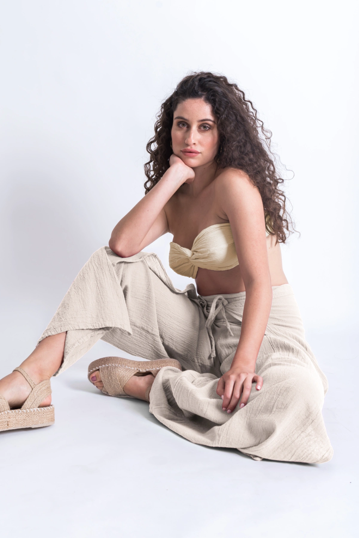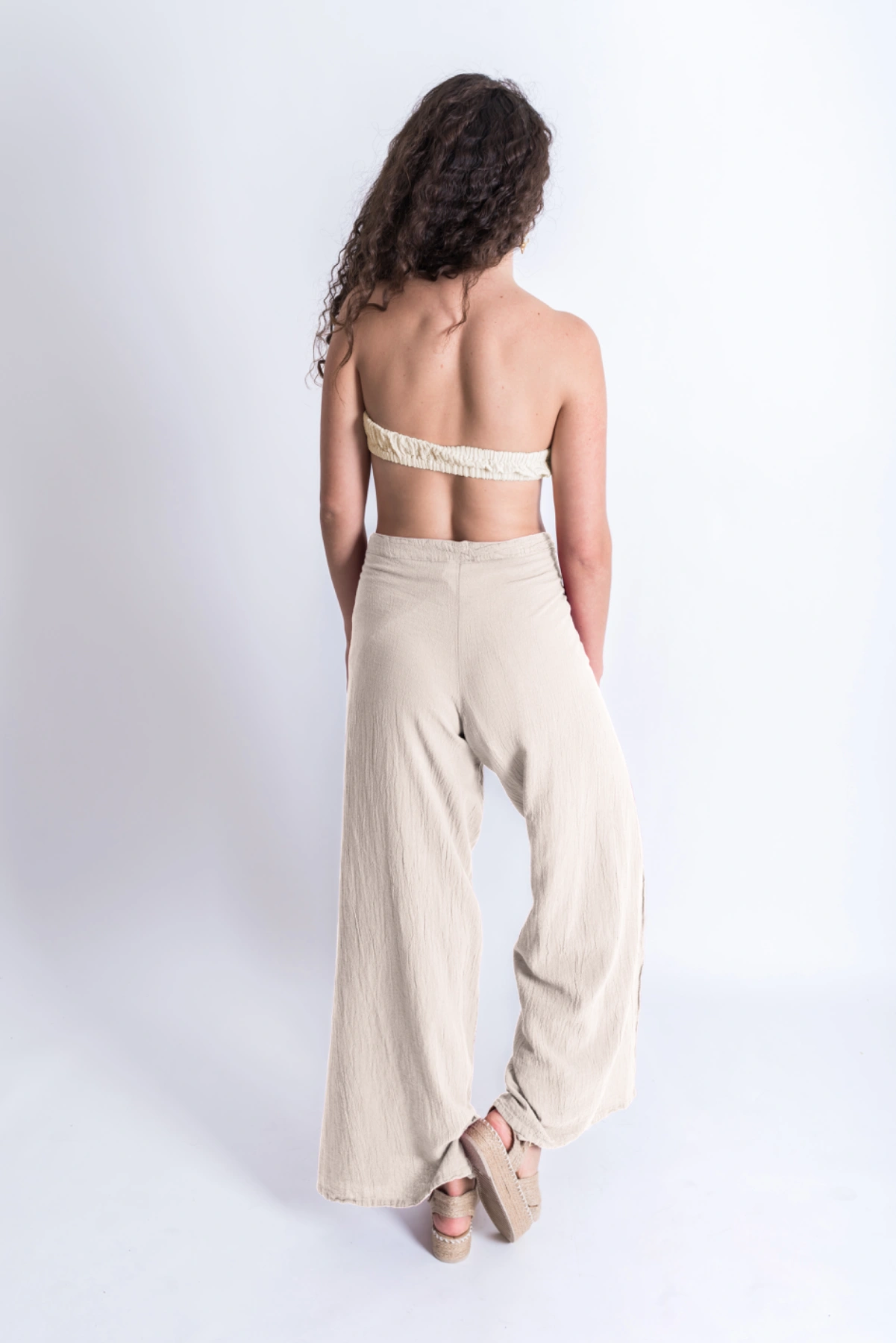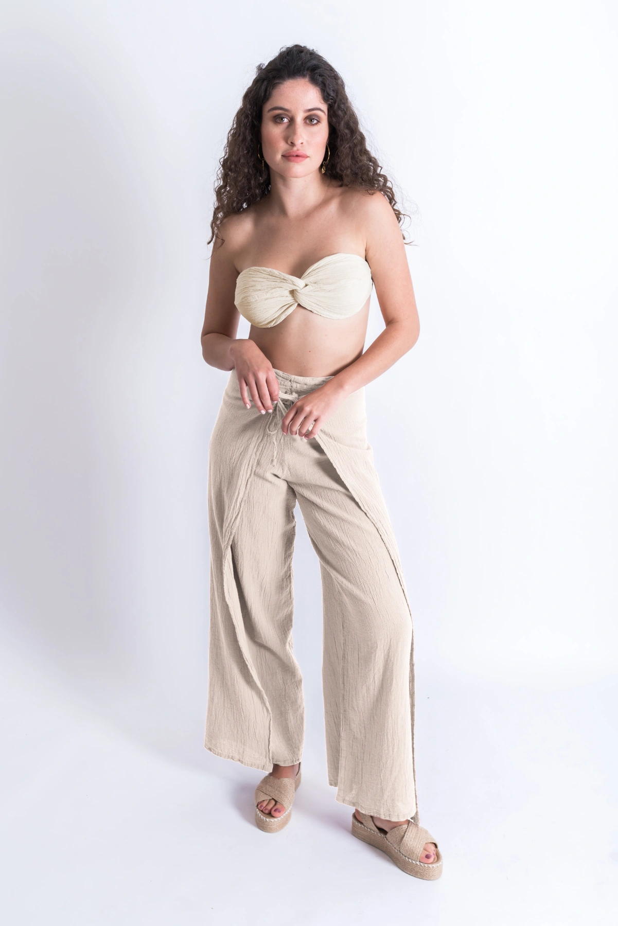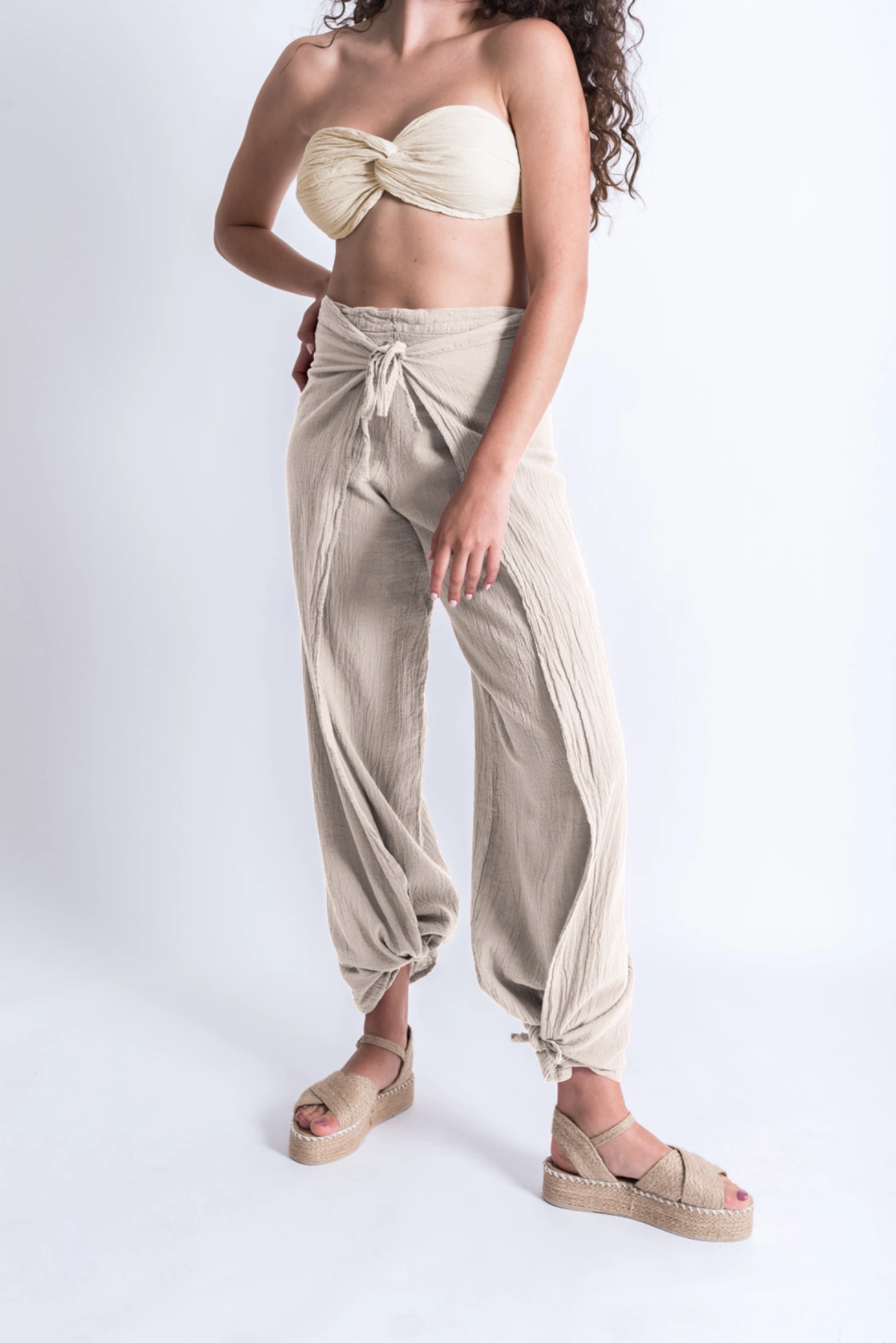 Pantalón envolvente de línea A con aberturas laterales que permiten anudarse para jugar con distintos estilos y siluetas. Diseñado originalmente en los noventa, se ha convertido en una de las piezas clásicas de Cecilia Nathal, manteniendo su frescura y vigencia con el paso del tiempo. Su estructura cruzada se ajusta al frente o en la parte trasera, mientras que las tiras añaden ligereza y movimiento. Pensado para acompañarte con naturalidad, es el aliado perfecto tanto en un día de playa como en la ciudad.