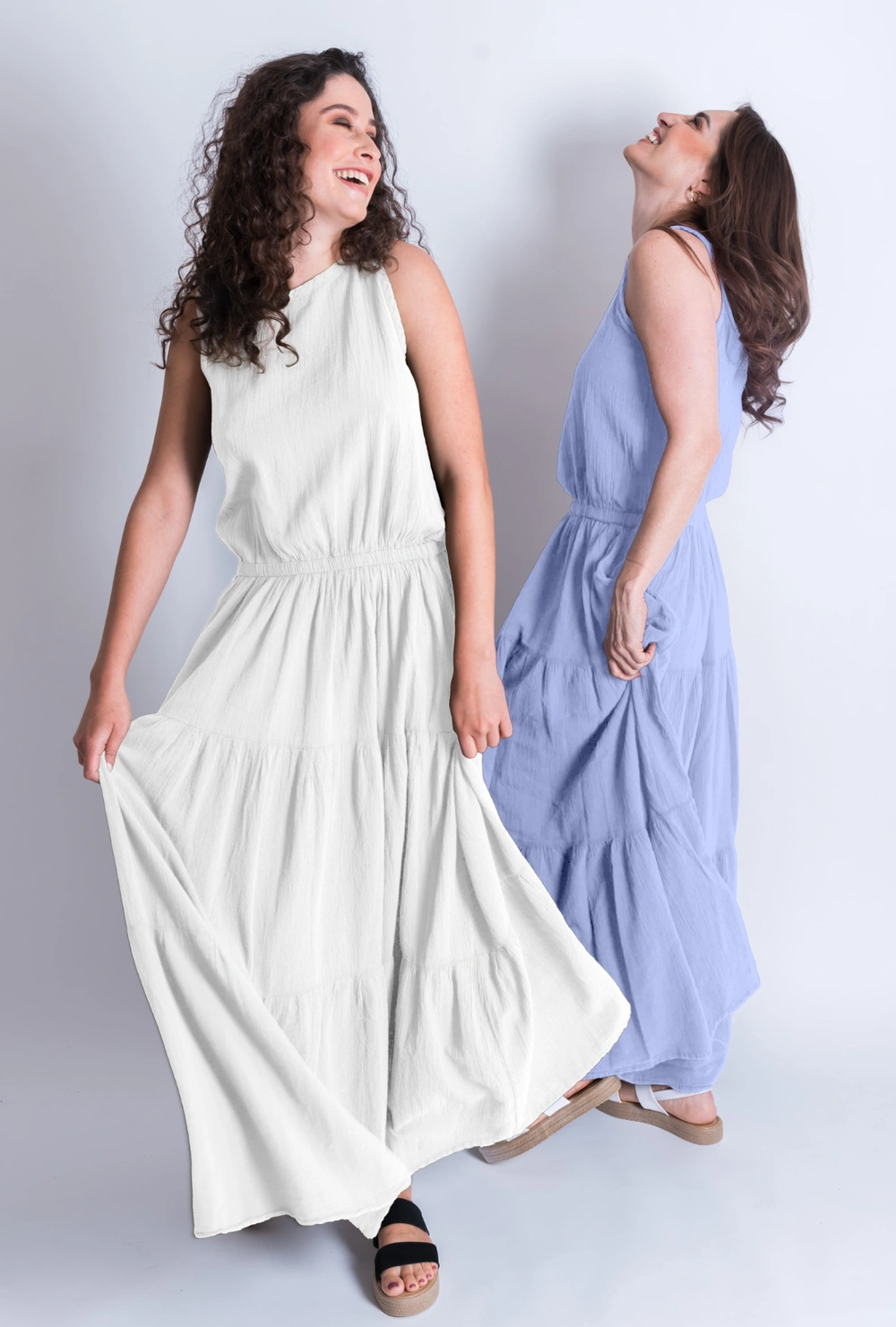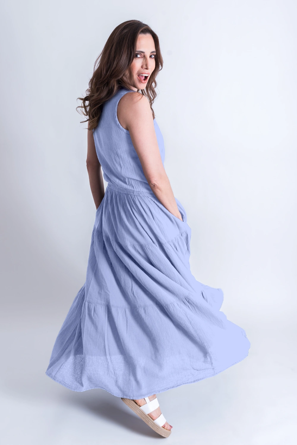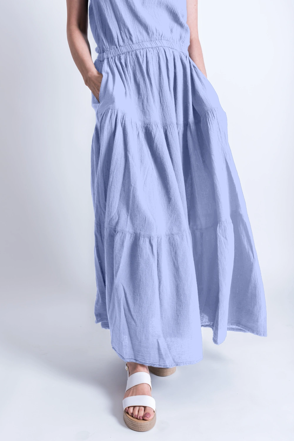 Vestido largo sin mangas con cuello cerrado y cintura elástica que realza la silueta sin perder comodidad. Incluye bolsillos prácticos y un faldón amplio con tres olanes que aportan movimiento y frescura. Su diseño versátil permite combinarlo con cinturón de piel o cadena para acentuar la figura. Perfecto tanto para ocasiones casuales como para eventos más formales.