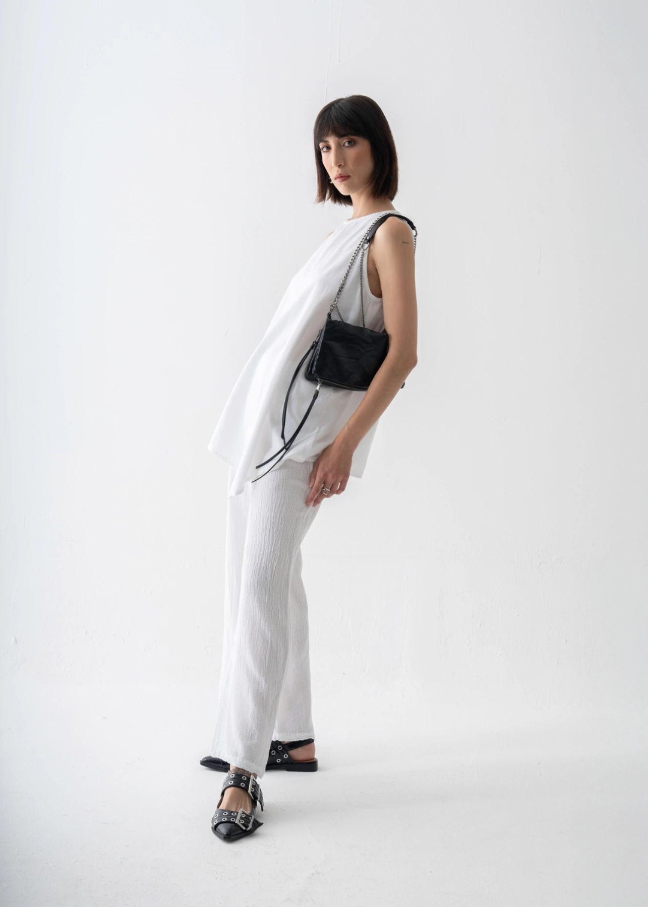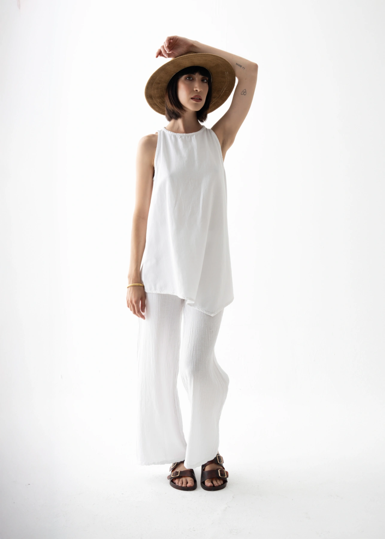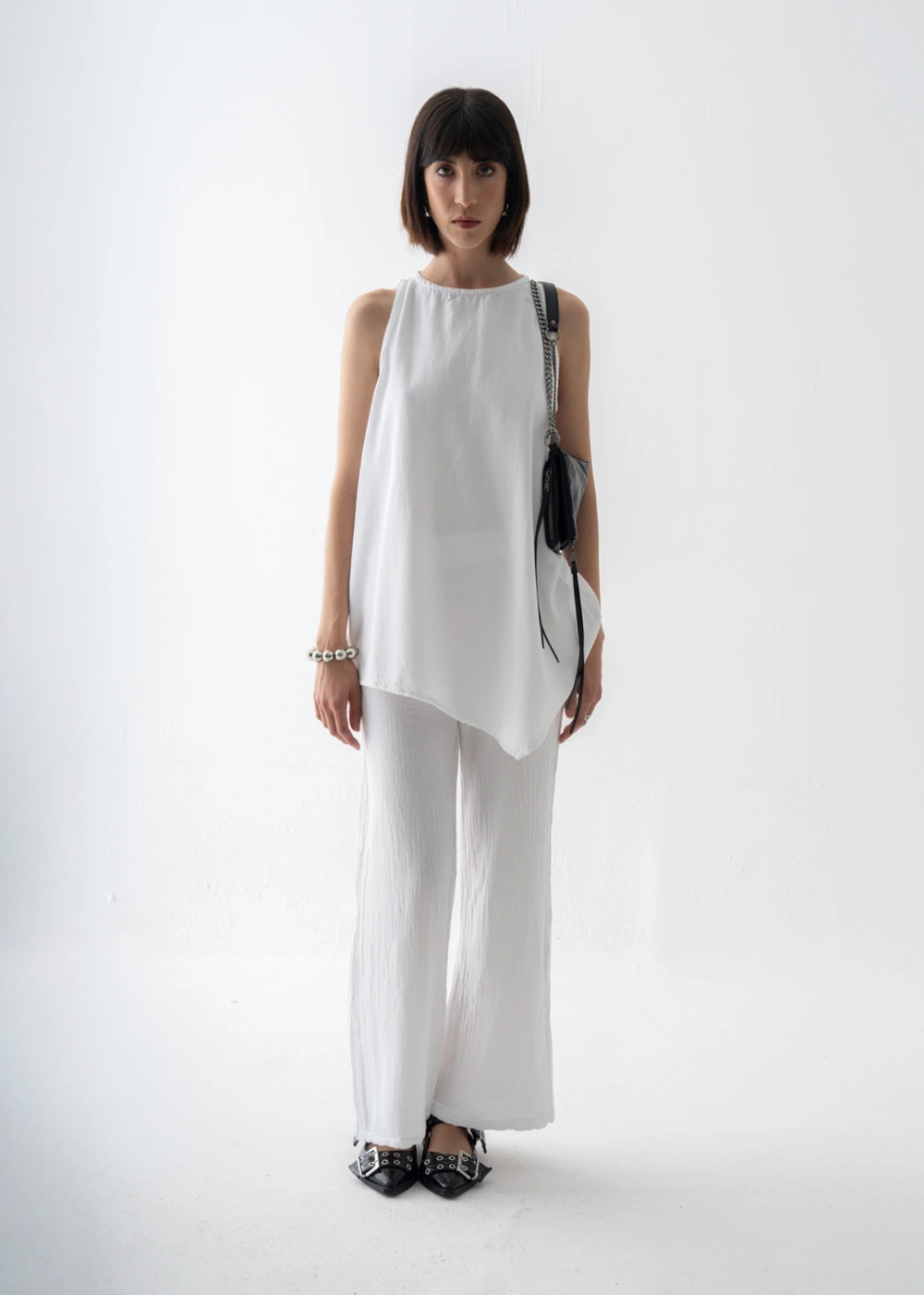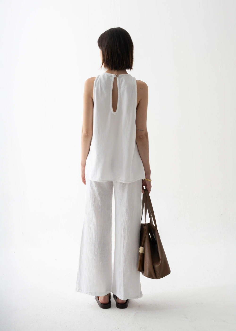 Esta blusa sin mangas se distingue por su caída fluida y elegante, con un escote redondeado que enmarca el rostro de manera delicada. Su silueta recta se prolonga en un bajo asimétrico que añade movimiento y modernidad a la prenda. La abertura en la espalda, cerrada con un pequeño botón, aporta un detalle sutil y sofisticado. Perfecta para llevar con pantalones amplios, faldas o incluso shorts, es una pieza versátil que pasa sin esfuerzo de la ciudad a la playa, siempre con un aire refinado y atemporal.