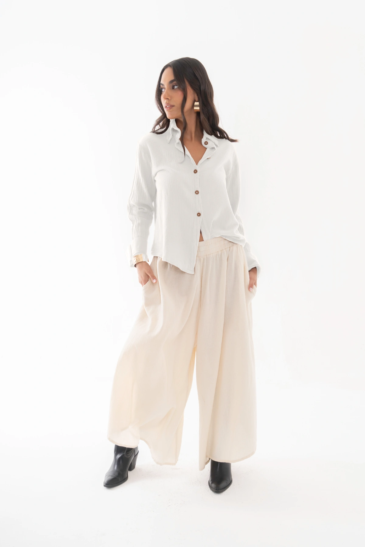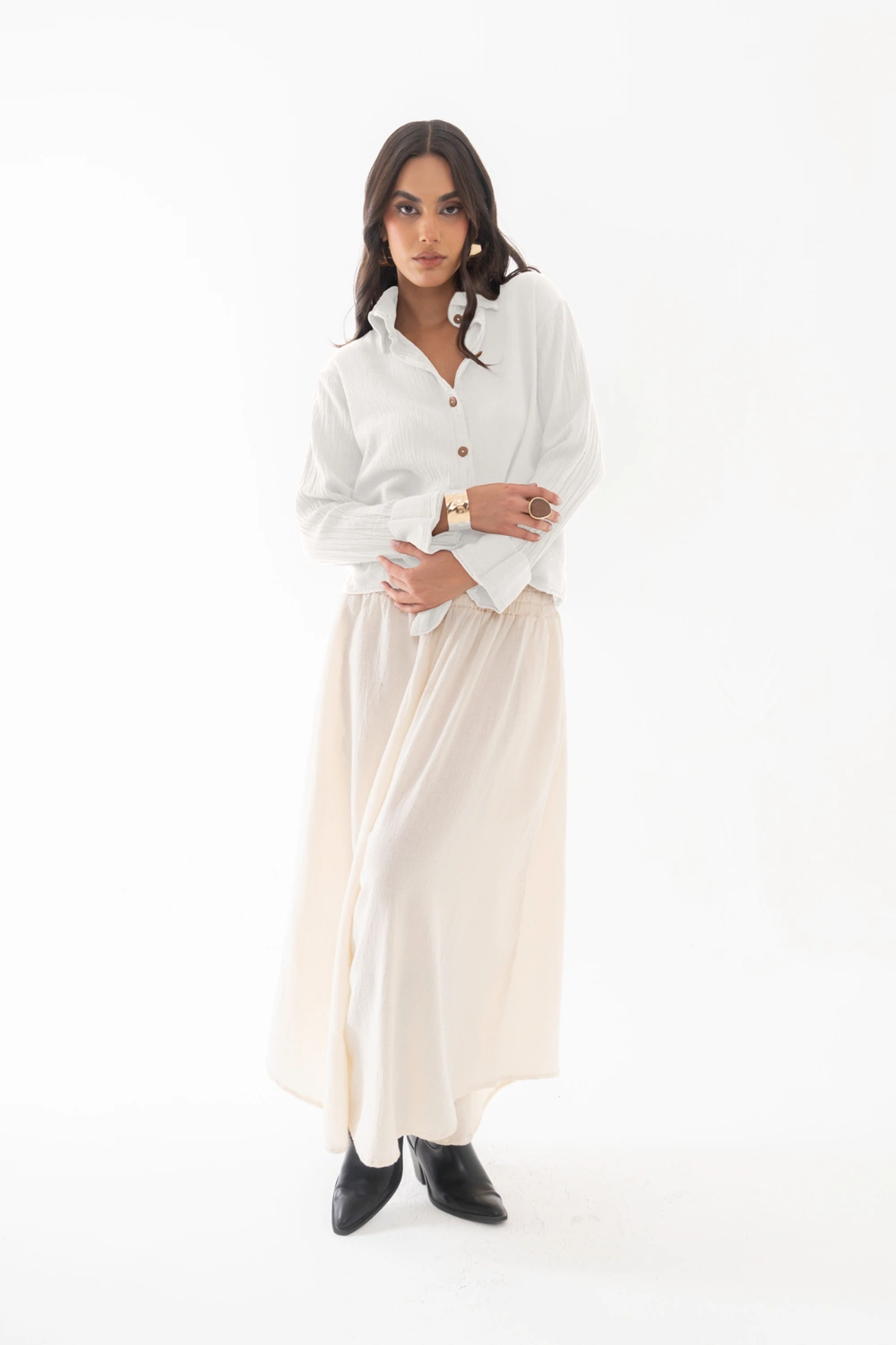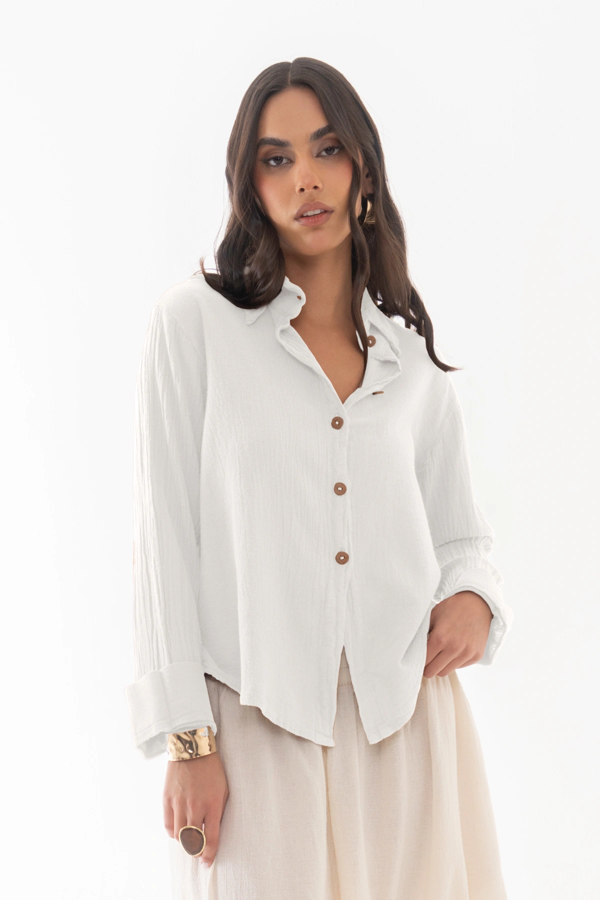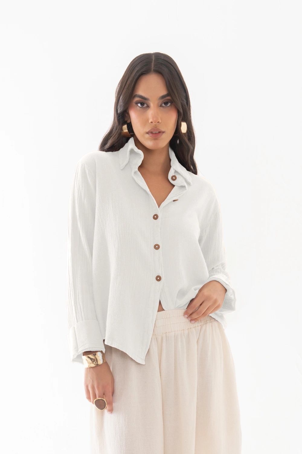 Blusa clásica de silueta recta, con cuello camisero y botones al frente. Su diseño de manga larga y caída ligera la hace versátil y fácil de llevar, ya sea cerrada o abierta como sobrecamisa. Perfecta para elevar un look casual o dar un aire pulido en cualquier ocasión.