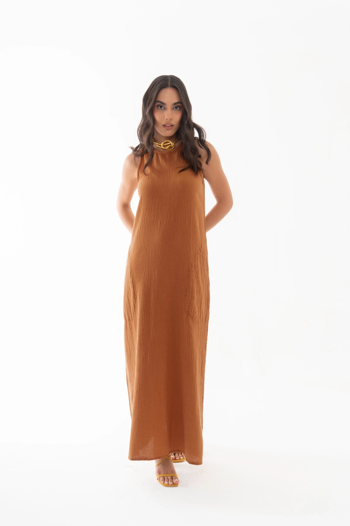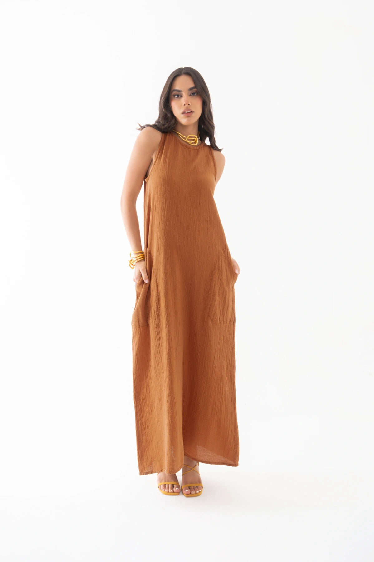 Vestido largo sin mangas, de silueta recta y caída ligera que aporta frescura y libertad de movimiento. Con cuello redondo y prácticos bolsillos laterales, es una prenda versátil que puede usarse sola para un look relajado o combinarse con accesorios para un estilo más urbano. Su diseño minimalista lo convierte en un básico atemporal para cualquier ocasión.